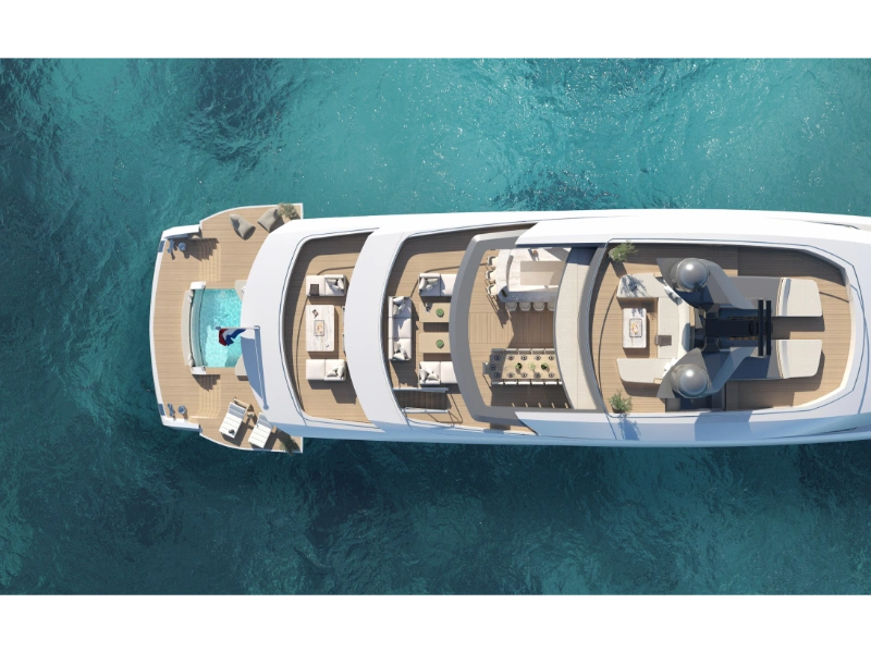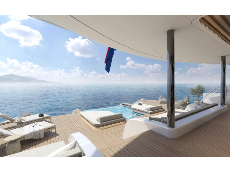 Project Monte Carlo is the epitome of modern yacht design, featuring a unique combination of elegance and functionality. The exterior, designed by the acclaimed Frank Laupman of Omega Architects, boasts sleek, flowing lines that enhance the yacht’s aerodynamic profile while providing ample space for relaxation and entertainment. The blend of glass and steel creates a striking visual impact, making Monte Carlo a true standout on the water.