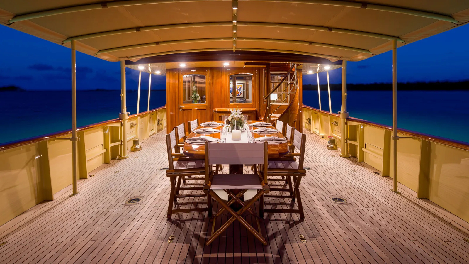 The yacht’s interiors, once featuring Art Deco accents, were streamlined to create a more comfortable and practical environment. The main saloon now functions as a relaxed lounge, while the previous indoor dining space has been converted into a media room. Al fresco dining is prioritized on the aft deck, showcasing a custom-built table and a weather-resistant Bimini awning.