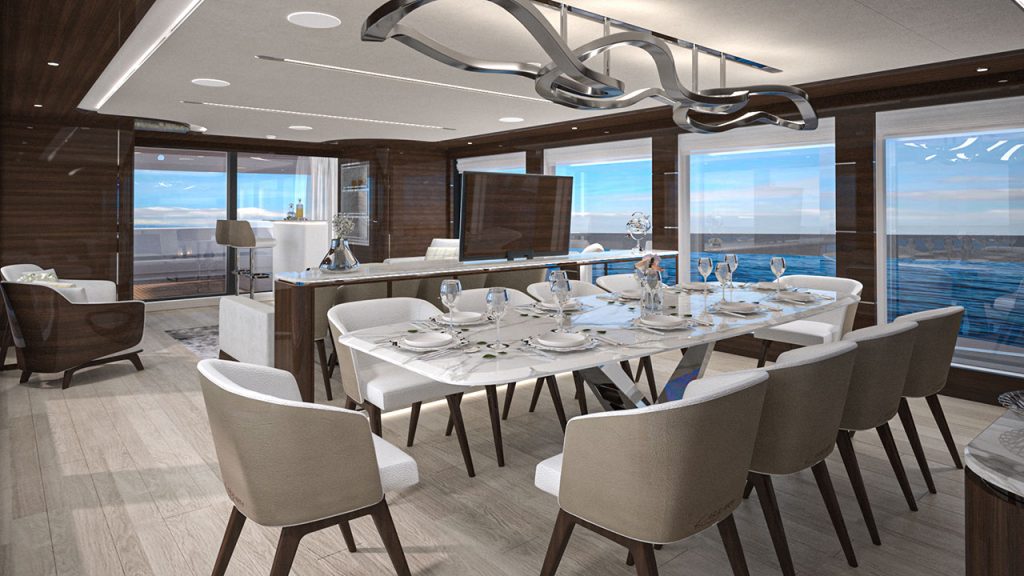 The UHV 100, with “UHV” denoting “ultra-high volume,” provides a total space of 400 square meters. The design of the yacht emphasizes openness, featuring notable elements such as a 42-square-meter main saloon and a 34-square-meter master cabin located on the main deck towards the front.