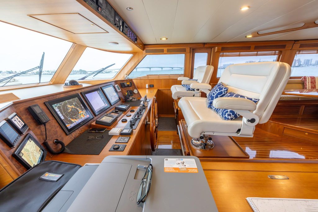 The enclosed Command Bridge features satin teak finishes with high-gloss teak and holly decks. It is fitted with Pompanette double-wide helm chairs, a generous L-settee offering 360-degree visibility, and a convertible queen-size berth with an ensuite head and shower. The electronics suite includes Garmin touch displays, dual ICOM VHF radios, and a Sea Keeper monitor, along with other state-of-the-art systems.