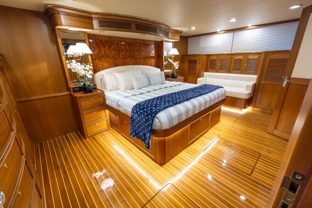 INDIGO features four staterooms, three of which are ensuite, while the fourth shares a head. The full-beam master stateroom is equipped with a king-size bed, ample storage, and portholes that invite natural light. The master head boasts granite countertops, Grohe fixtures, and a spacious shower.
